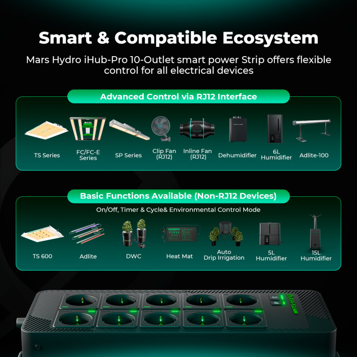 Mars Hydro iHub Pro — это интеллектуальный центр управления гроурумом, оснащённый 10 независимыми розетками для подключения освещения и вспомогательного оборудования. Устройство создано для полной автоматизации процессов выращивания и объединяет все ключевые элементы гроурума в одной системе.
