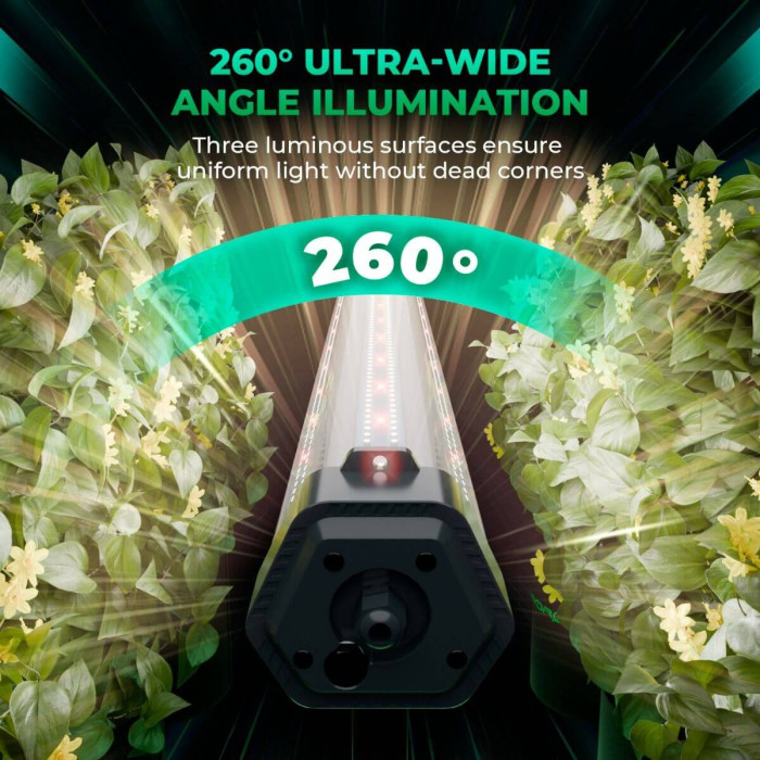 Светильник Mars Hydro Adlite 100 имеет широкий угол рассеивания 260°, что позволяет равномерно распределять свет под кроной растений, эффективно освещая нижние и средние ярусы без локальных пересветов.